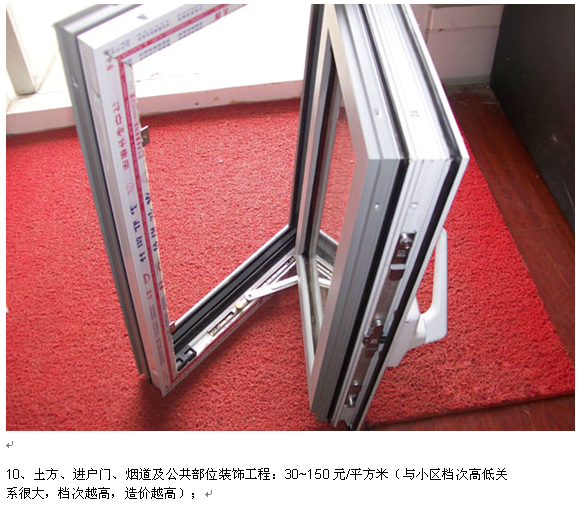9、门窗工程(不含进户门):每平方米建筑面积门窗面积约为0.25~0.5平方米(与设计及是否高档很大关系,高档的比例较大),造价90~300元/平方米,一般为90~150元/平方米,如采用高档铝合金门窗,则可能达到300元/平方米;