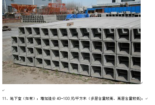 2、钢筋:40~75KG/平方米(多层含量较低、高层含量较高),合160~300元/平方米